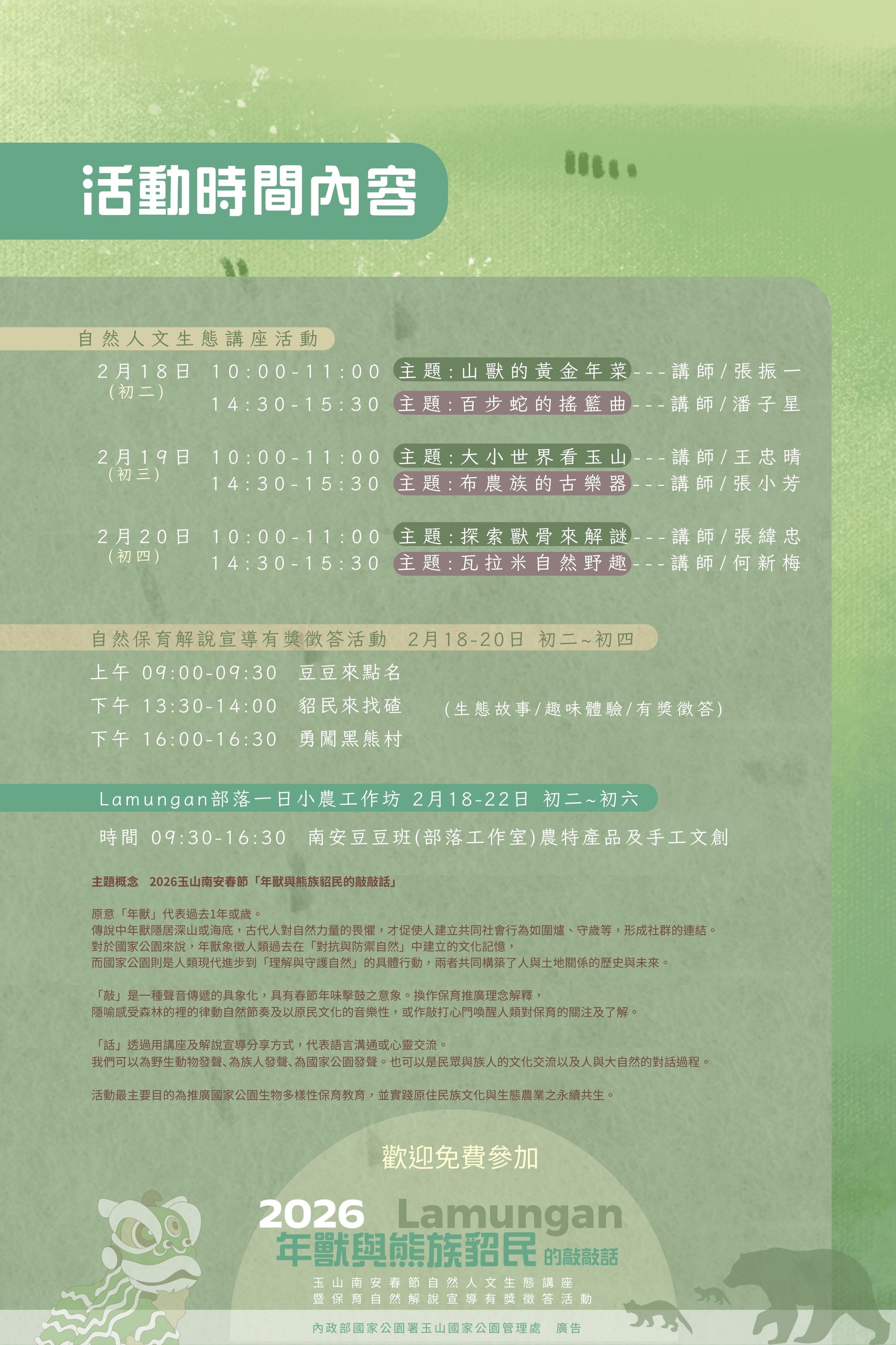 活動主題「年獸與熊族貂民的敲敲話」,象徵人與自然之間的對話和諧關係。 在走春過程中一起響應「無痕山林」,不干擾野生動物生息。在萬物共榮的新春之際,唯有懷揣著敬畏之心,才能真正與大地和諧共存。