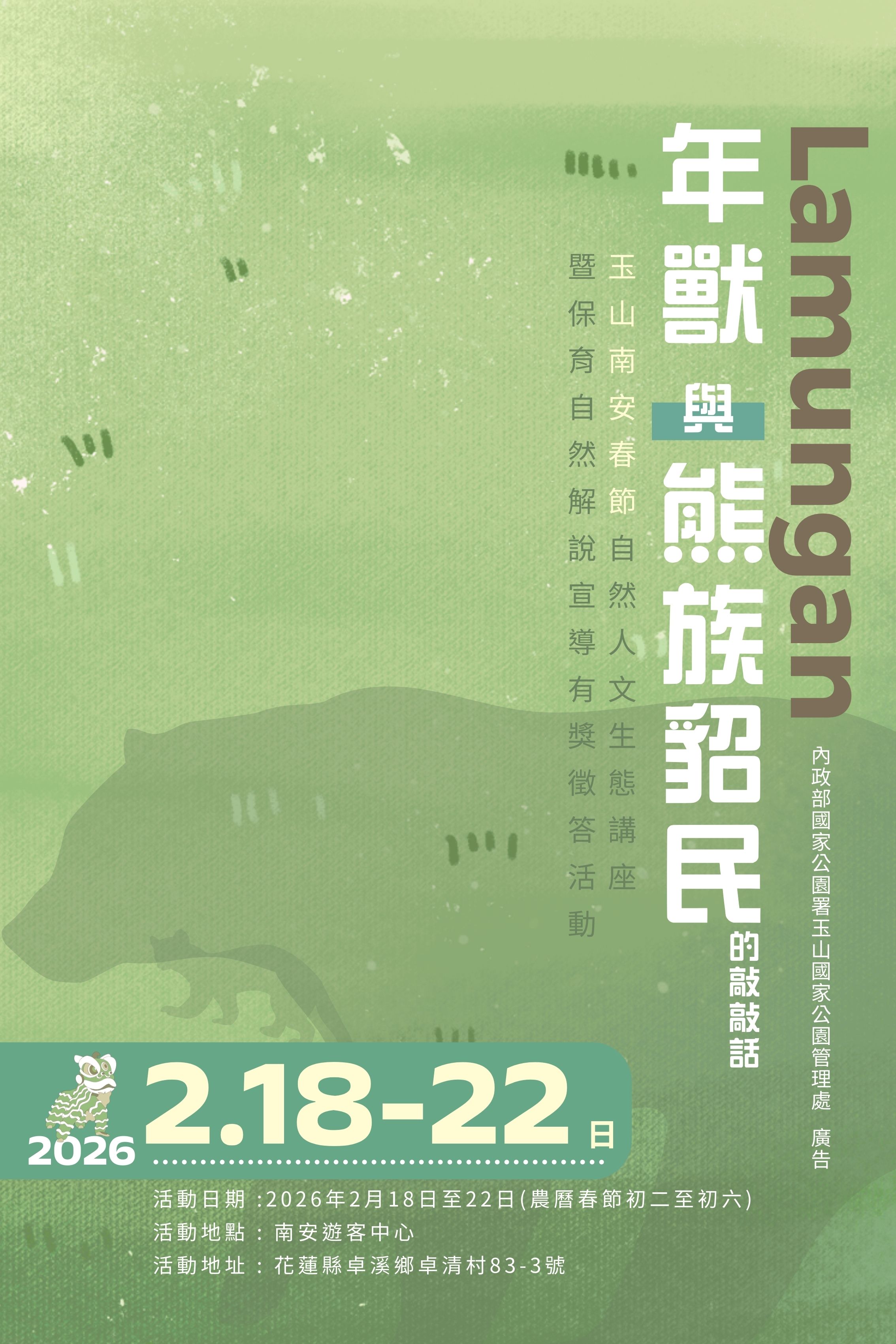內政部國家公園署玉山國家公園管理處(以下簡稱玉管處)訂於115年2月19~20日(星期四~星期五),在南投縣信義鄉東埔1鄰東埔服務中心廣場,辦理「115年東埔部落春節文化展演~聆聽東埔天籟之音」活動(...