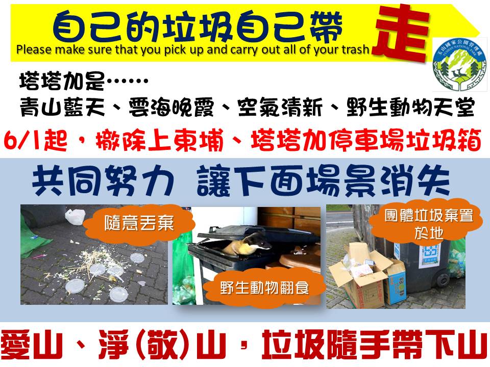 玉管處在今(109)年4月1日已於塔塔加遊憩區的公廁、停車場、炊煮區等處懸掛「敬山、愛山 垃圾請帶下山」旗幟,目前的垃圾子車也在去(108)年懸掛「愛護環境,請將垃圾帶下山」醒目標語,廁所、布告欄等處都有張貼宣導海報,預告遊客並培養遊客的觀念。在6月計畫正式上路後,除安排工作人員及志工在停車場及廁所周遭向遊客(團客、散客)宣傳勸導外,如有發現遊客亂丟垃圾行為,將依國家公園法規定取締開罰。請遊客配合,讓我們共同努力,朝「愛山、淨(敬)山,垃圾隨手帶下山!」的美好目標努力。