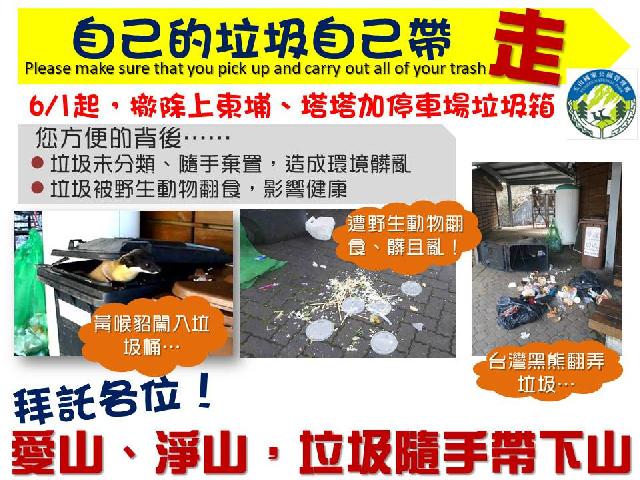 玉管處表示,據觀察原停車場垃圾子車內很大比例是遊客於上山途中產生的垃圾,隨車帶下山並不困難。遊憩區垃圾收集以處理園區內遊憩的垃圾為主,並推動遊客將自己的垃圾帶下山。6月1日起,將移除上東埔停車場及塔塔加停車場兩處舊式垃圾子車,步道遊憩垃圾收集點改至排雲登山服務中心旁並縮小容量,推動垃圾帶下山,期達到垃圾減量。