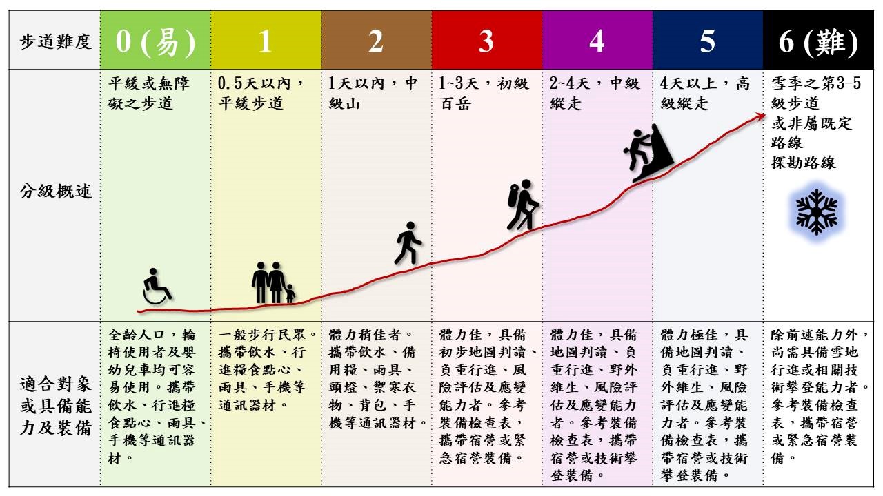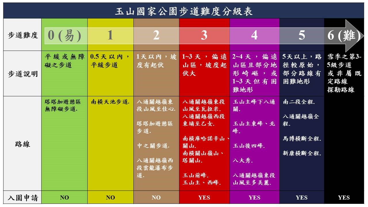 玉管處進一步說明,玉山國家公園步道可分為0級到6級,0級步道可供輪椅及嬰幼兒車使用;1級到2級為1天內可完成,且設施良好;3級到5級以上則屬較偏遠山區,建議民眾具備地圖判讀、負重行進、風險評估及應變能力;第6級則為積冰雪的第3級到第5級步道或非屬既定路線,至少需具備雪地行進或相關技術攀登能力。從事登山者要能掌握自身生理狀態及體能剩餘值,如平安完成行程抵達登山口尚有30%的餘裕,就表示下一趟行程可考慮調升更高1級的難度;若是抵達登山口已精疲力竭,就建議要從基礎體能鍛鍊著手。