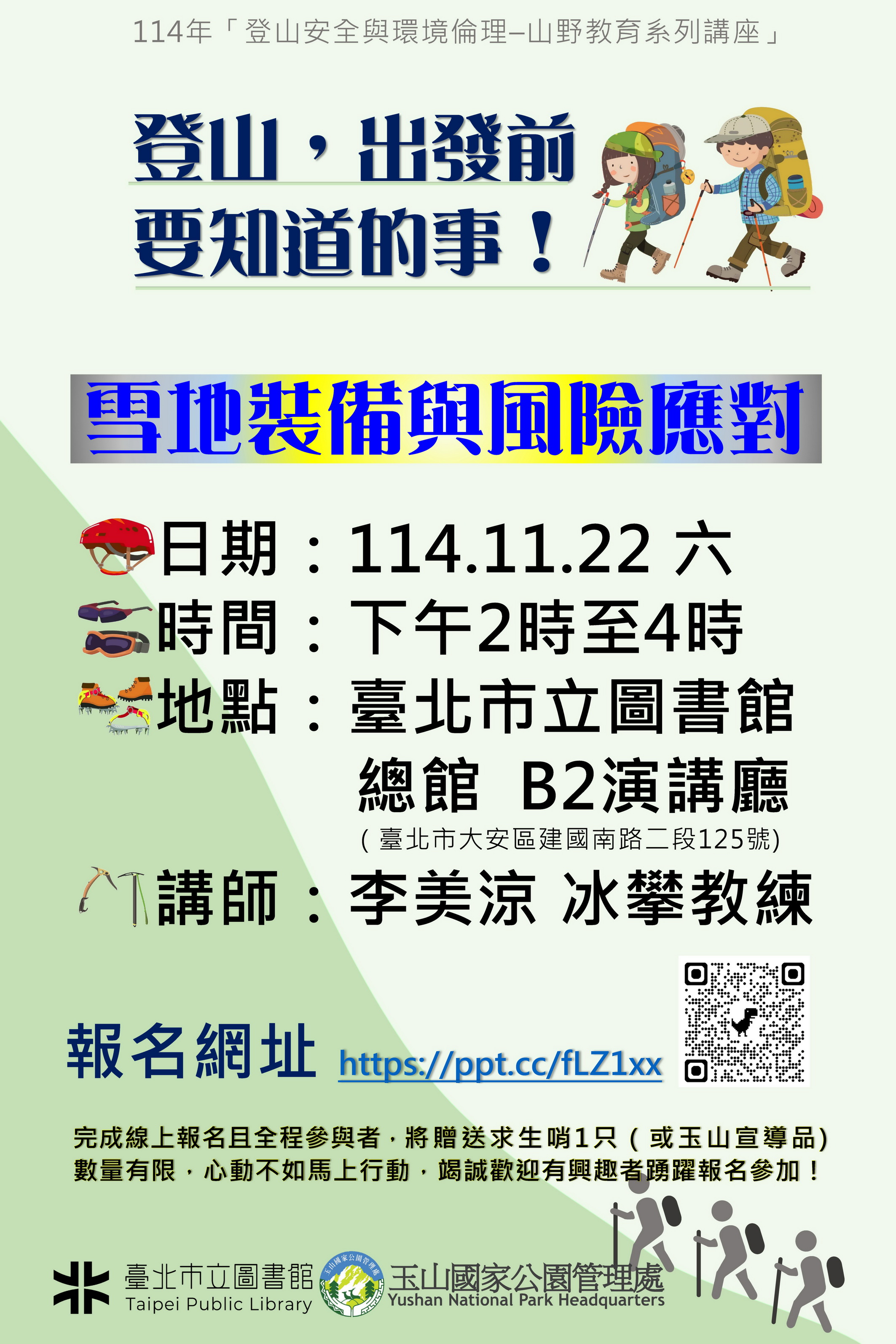 ⛰️誠摯邀請對臺灣冬季高山美景及學習登山安全有興趣的朋友踴躍報名參加,和冰攀專業職人李美涼教練共同學習【雪季登山】保命守則,由她帶領大家認識臺灣冬季高山環境,探索雪地登山風險,掌握雪地登山裝備的運用以及必備技能。期待藉由本次講座,協助山友在【雪季登山】活動中能安全且盡情感受大自然的壯麗與美好!誠摯期待您的參與!
