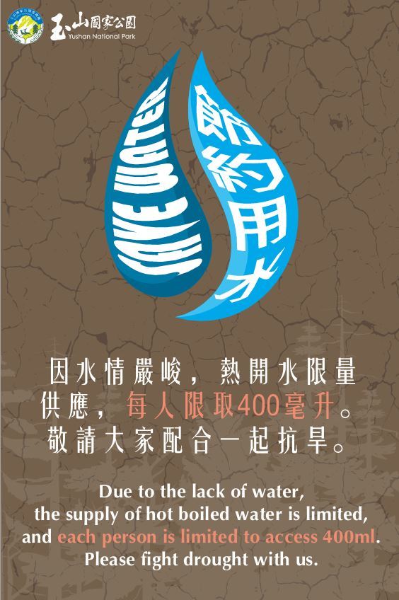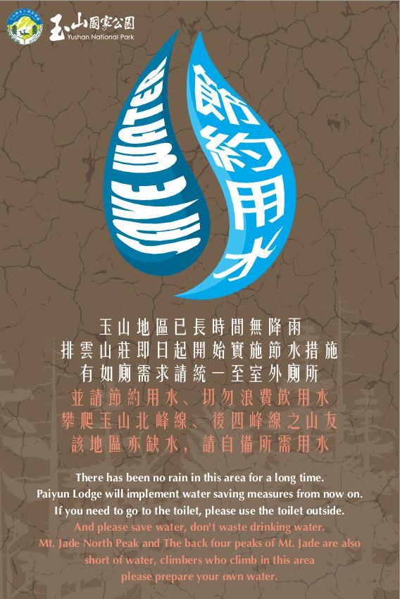 麻煩各位前來的山友務必配合節水措施,共同度過旱季!