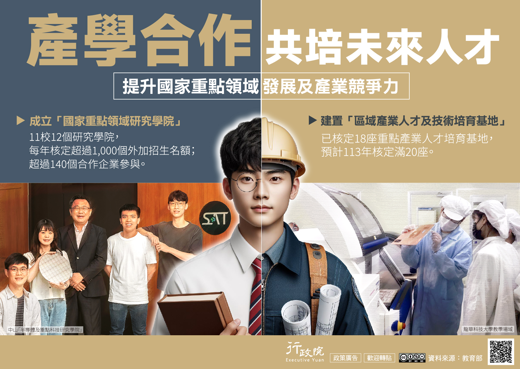 人才培育基地是重要的技職教育政策,設立研究學院亦能帶動大學產學合作及人才培育,促進國家重點領域發展。行政院與教育部持續推動「產學攜手合作計畫2.0」,有效整合技術型高中、技專校院至研究端,使我國人才培育大步邁前。