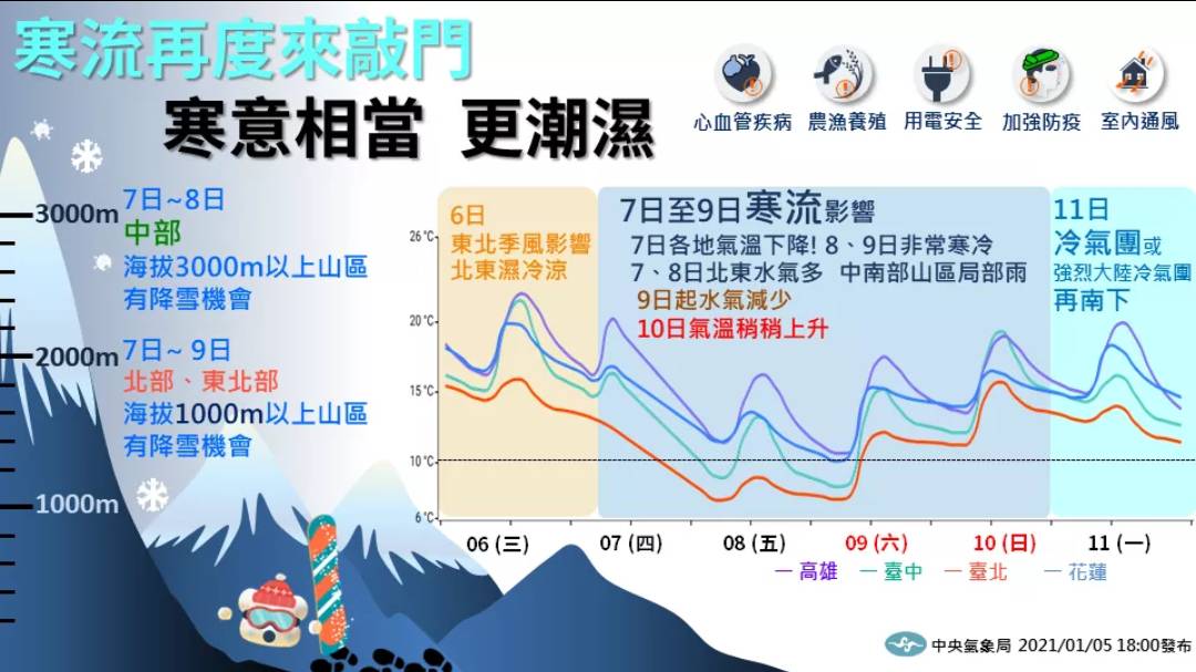 中央氣象局:明(7日)天開始,冷空氣升級為寒流,各地都會有感降溫,明(7日)天越晚越冷,入夜有機會降到10度以下,週五全天到周六,是這波寒流最強時間點,台南以北、東北部7到9度。其他地區11到12度,沿海空曠地區,可能更低,這波跟上周不同,偏「濕冷」天氣型態,高山有降雪機會,必須特別注意…….。