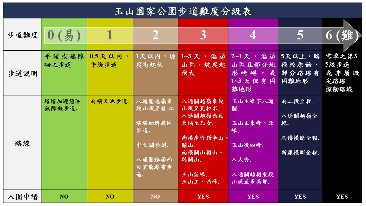 國家公園步道系統分級及裝備檢查表:https://reurl.cc/oxezy5