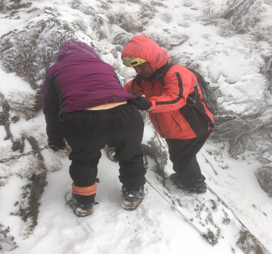 即便做好裝備、登山活動計畫,也訓練好技術體能,但是在山區遭遇到天氣變化,也是老天爺給的另一項挑戰。山區氣候變化劇烈,在不同季節上山應攜帶的雨具、保暖衣物都要有所考量;比如在12月至3月上山,就必須先準備好冰爪等冰攀用具,或如遇雪就要撤退下山,而非僥倖通過或拖延下撤時機,導致身陷險境外,也徒增救援困難。
