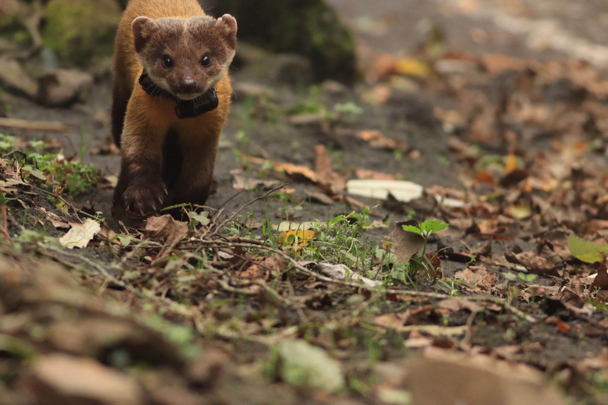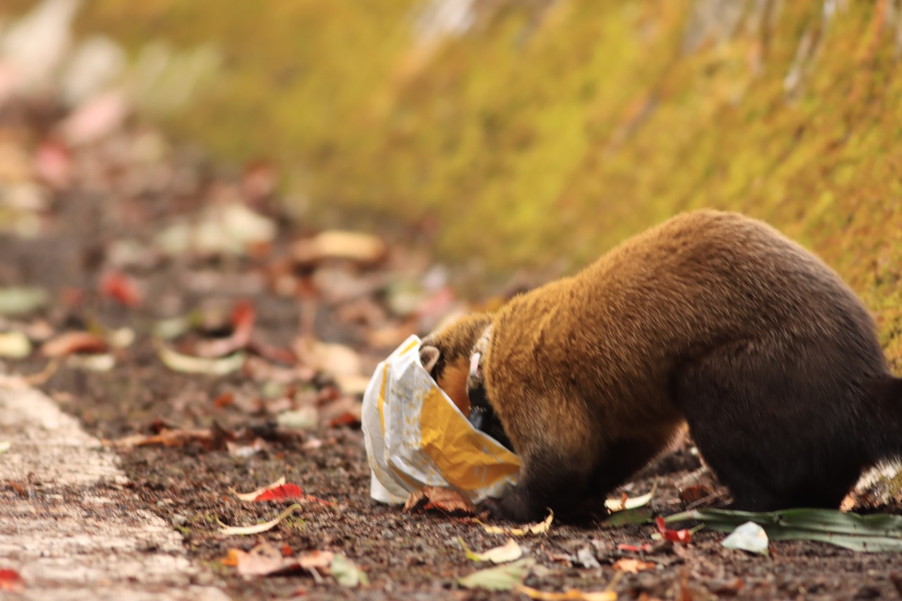 研究團隊透過不同個體頸圈上的不同顏色標記,及利用繫放追蹤技術及人員的目擊回報,發現在重要的遊憩據點如:上東埔停車場、塔塔加遊客中心前廣場等……,遊客較密集的地點,經常有黃喉貂食用廚餘及垃圾的紀錄(圖2、3)。這些人為棄置的廚餘、垃圾很可能導致野生動物或引起遊蕩犬、貓前來聚集覓食,增加人畜共通傳染疾病在野生動物、遊蕩動物及人類之間擴散傳播的風險。因此,本處於今年元旦起,逐步撤除園區的垃圾桶,希望降低野生動物翻找垃圾及勿食人類垃圾的機會。