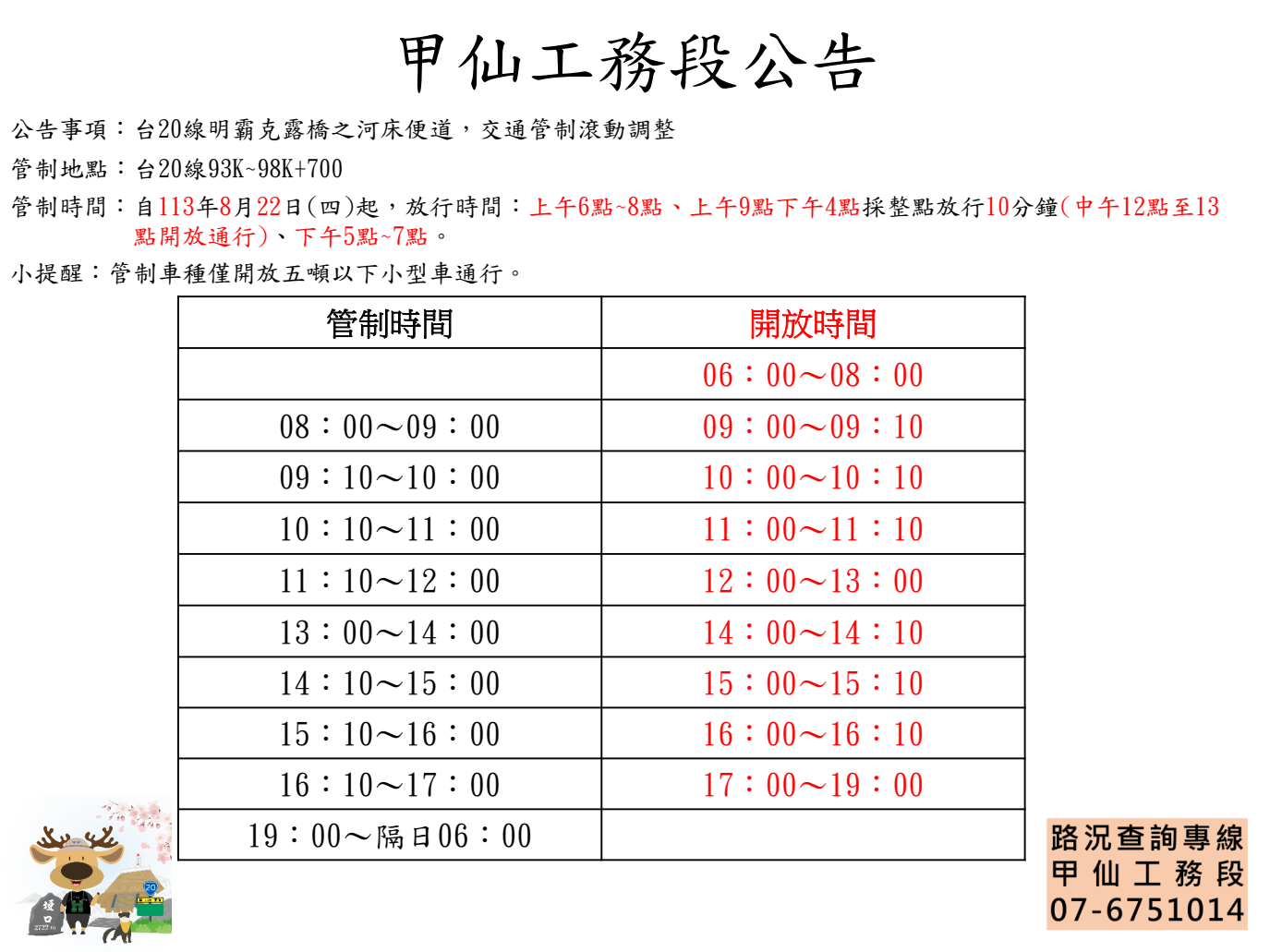 (一)自(8/22)日起,開放通行時間調整:上午6點~上午8點、上午9點至下午4點每小時開放十分鐘(中午12點至13點開放通行)、下午5點~下午7點供車輛通過,其餘時段暫不開放通行。